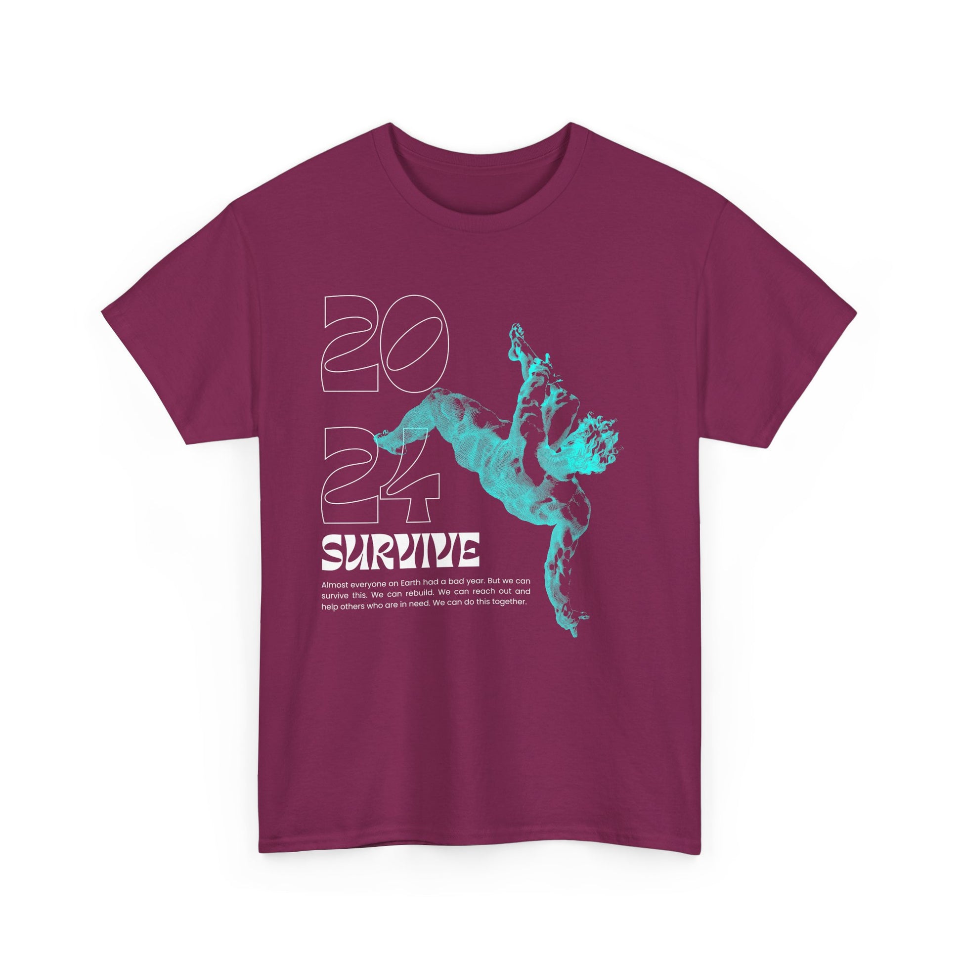 A unisex heavy cotton tee with a design that reads 'We survived 2024 together'. This tee gives off a sense of camaraderie and resilience, perfect for those who want to commemorate overcoming challenges together. Ideal for adults looking for a comfortable and durable shirt to wear year-round that can be styled casually or semi-formally.