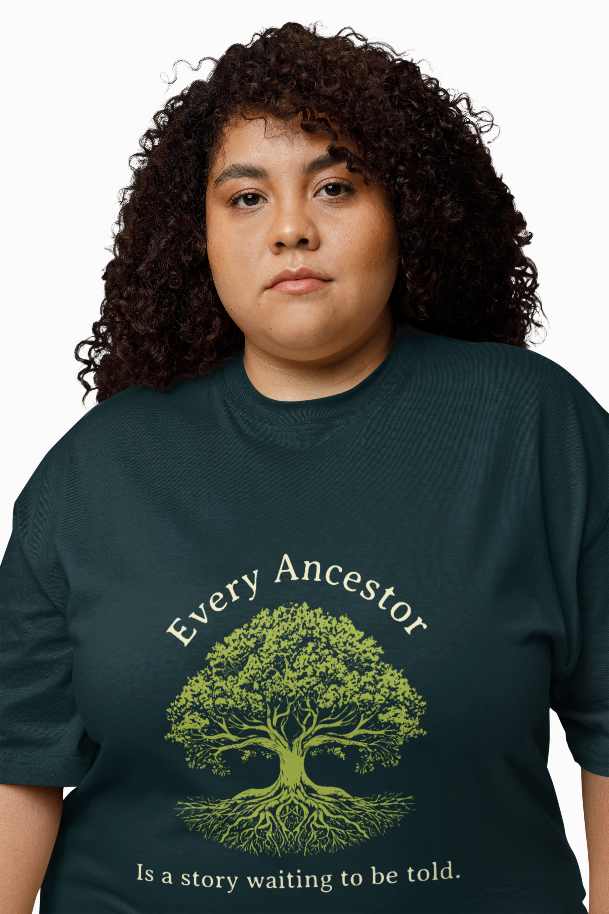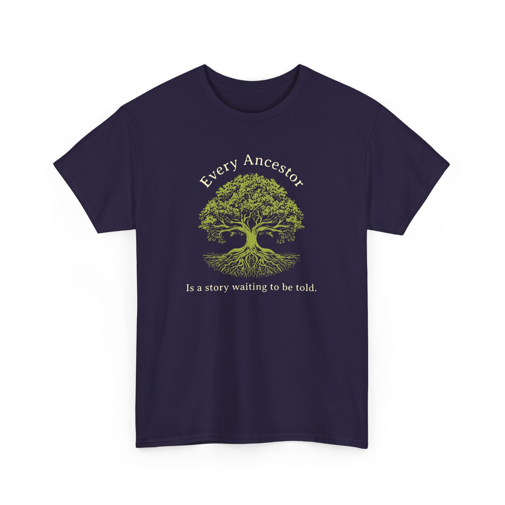 An ethically made and sustainable T-Shirt featuring a heartfelt message 'Every ancestor is a story waiting to be told.' This classic fit tee is crafted from medium fabric for year-round comfort, ideal for adults. Perfect for casual wear, this T-Shirt adds a touch of sentimentality to any outfit. Relevant for family gatherings, family reunions, storytelling events, and heritage celebrations.