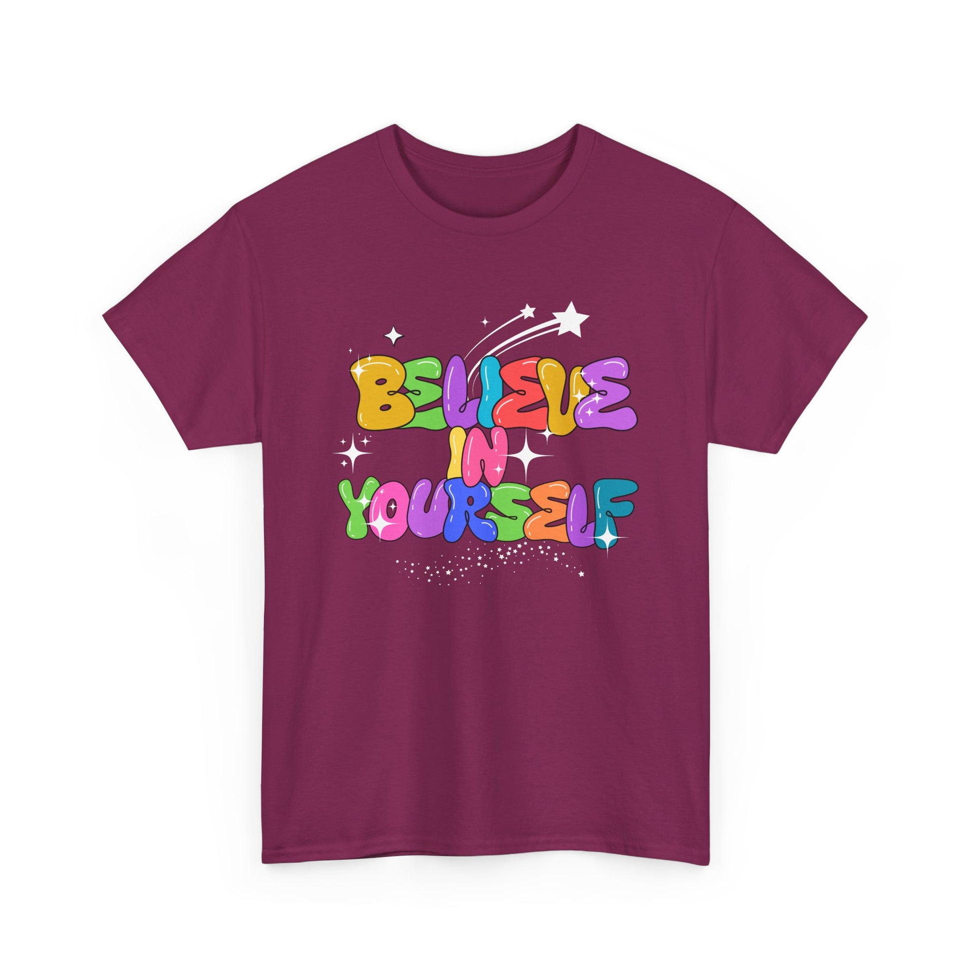 A motivational Tee with the phrase 'believe in yourself' to inspire confidence and positivity. Perfect for anyone looking to boost their self-esteem and stay motivated. Ideal for daily wear or as a thoughtful gift for birthdays, graduation, or any special occasion.