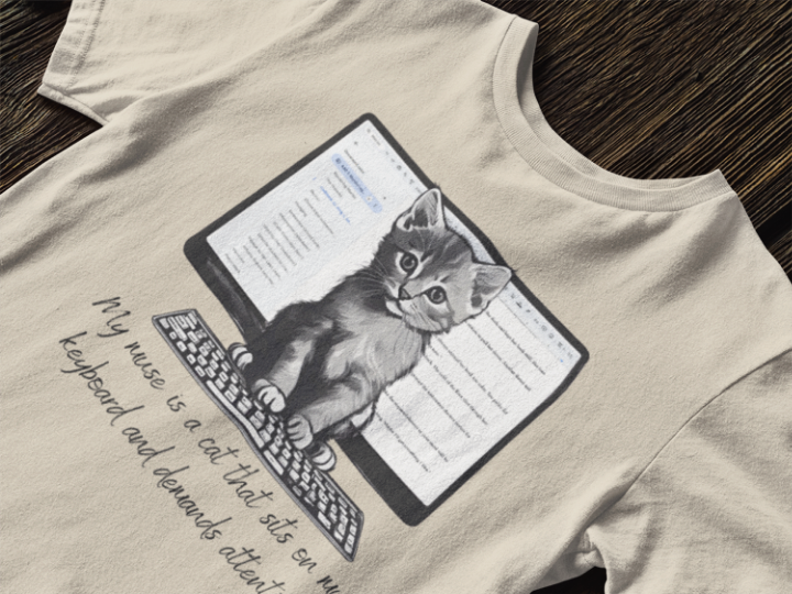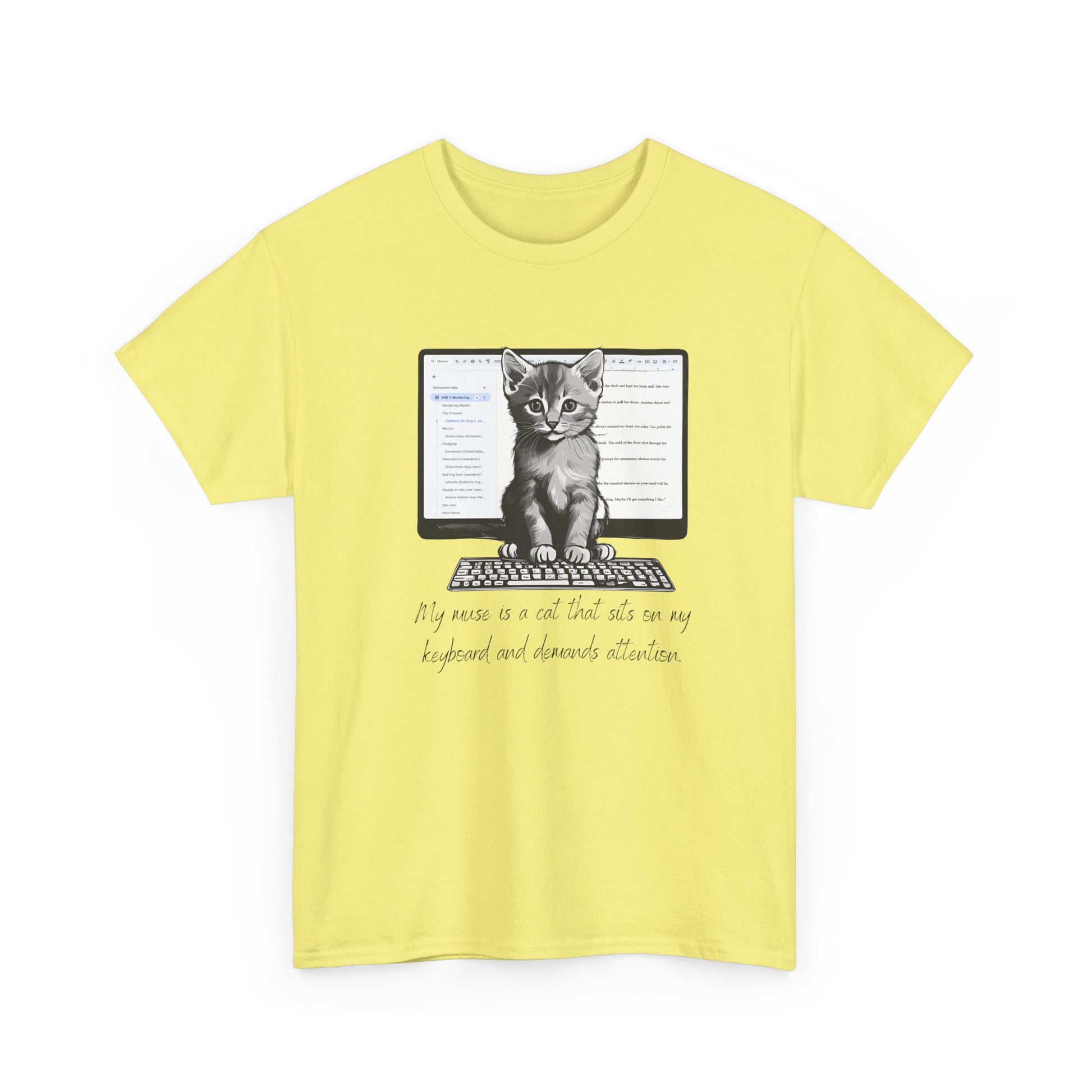 A tee featuring a design of a cat that sits on a keyboard, demanding attention. This tee gives off a cozy and playful vibe, perfect for cat lovers and creative individuals. Ideal for casual wear or as a statement piece, this tee is relevant for cat-themed holidays or everyday wear.