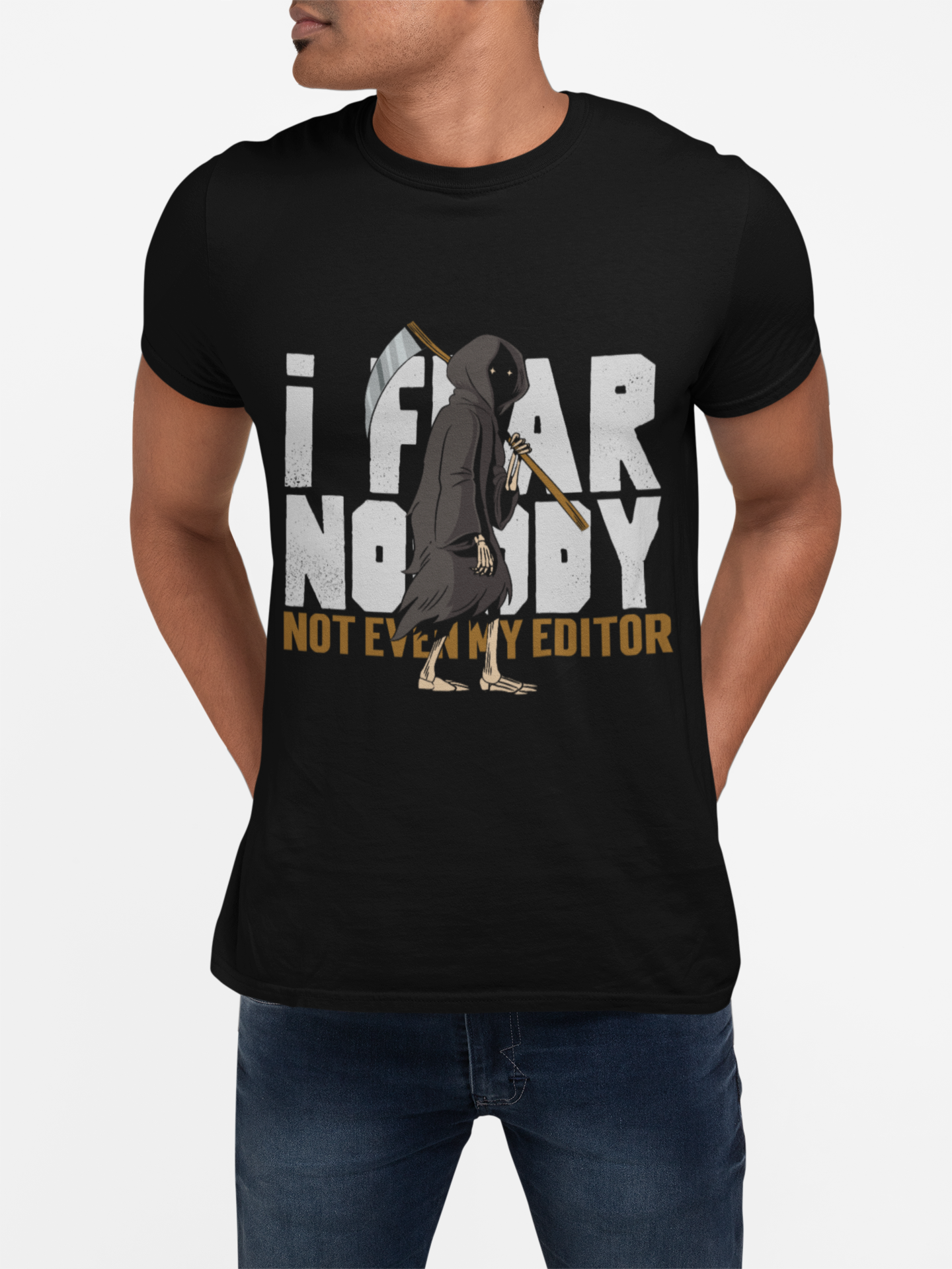 This T-Shirt exudes confidence with the bold statement 'I fear nobody Not even my editor'. Perfect for writers, editors, or anyone with a fearless attitude. Suitable for casual wear or as a statement piece. Ideal for gifting during birthdays, holidays, or as a special treat for yourself.