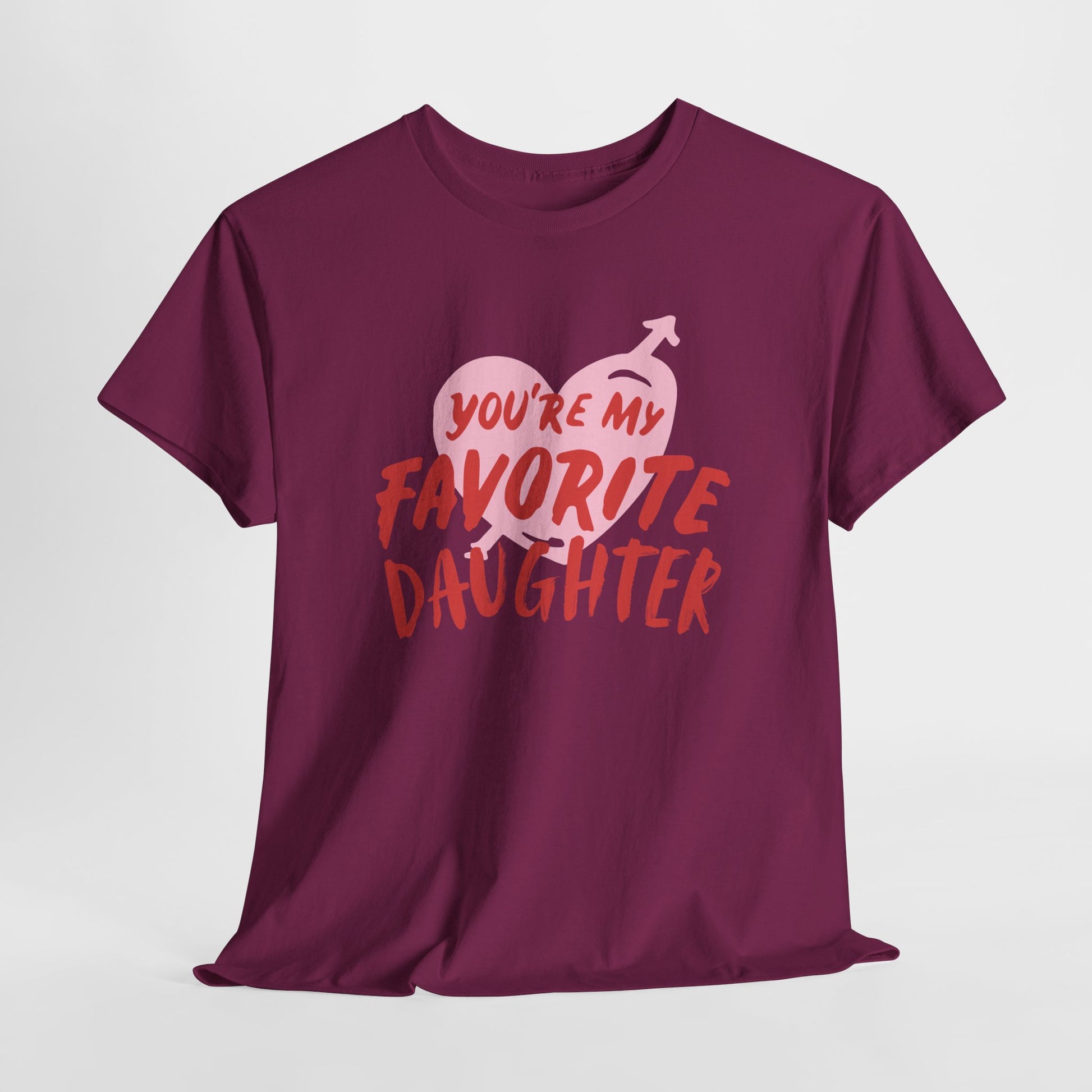This unisex heavy cotton tee is the perfect addition to any wardrobe. With its eye-catching design that proudly states 'You're My Favorite Daughter', it's a great way to celebrate family bonds in a light-hearted manner. The soft cotton fabric provides ultimate comfort, making it ideal for casual outings, family gatherings, or even cozy nights at home. Perfect for daughters to wear on special occasions like birthdays or Mother's Day, this tee can also be a thoughtful gift from mothers wishing to showcase their love. It resonates with those who appreciate personal connections and want to wear their heart on their sleeve.
