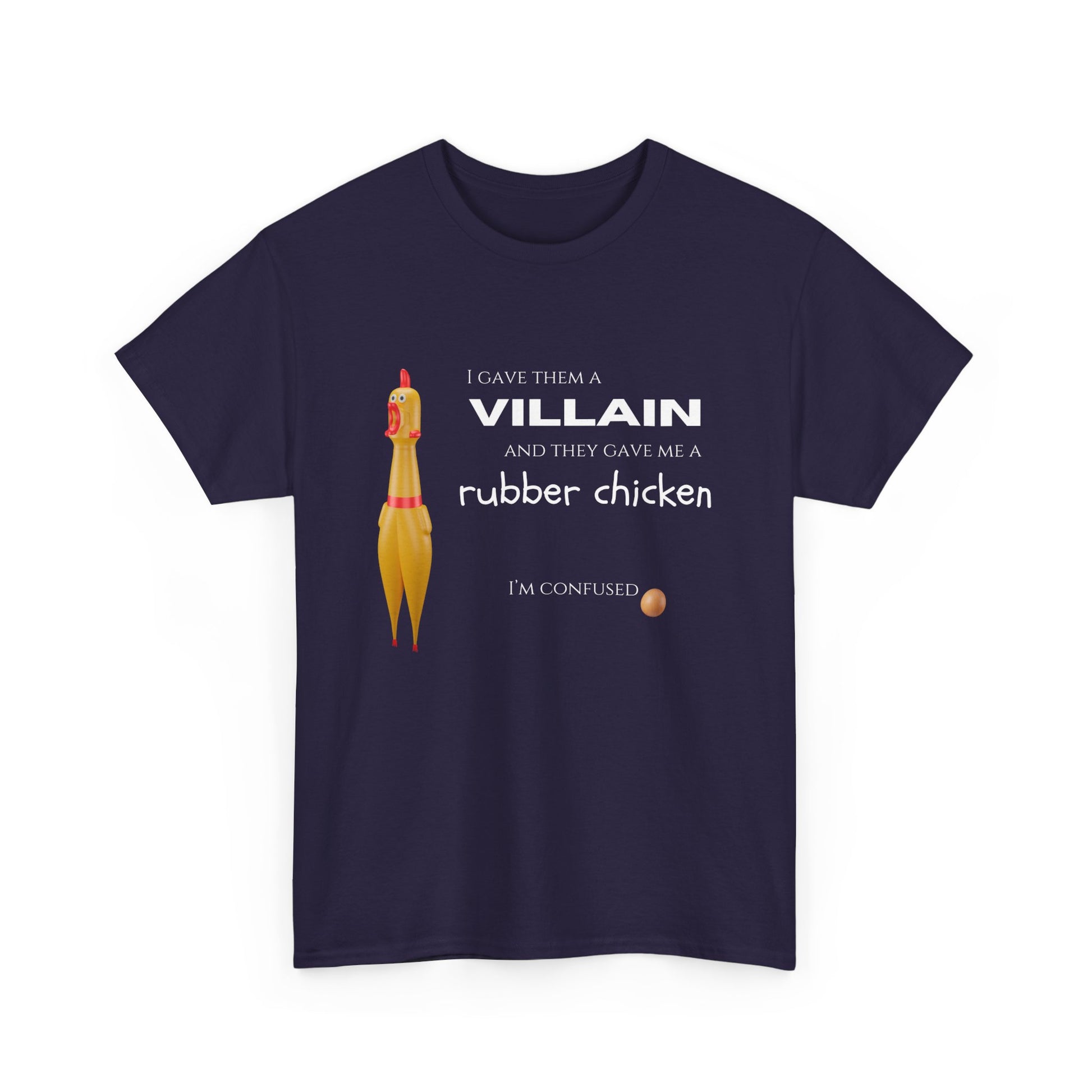 This T-Shirt features a quirky design with the phrase 'I gave them a villain, they gave me a rubber chicken I'm confused'. It offers a comfortable fit and versatile style that can be worn casually or semi-formally. Perfect for adults who appreciate unique and humorous designs, suitable for gifting during birthdays, holidays, or just for fun.