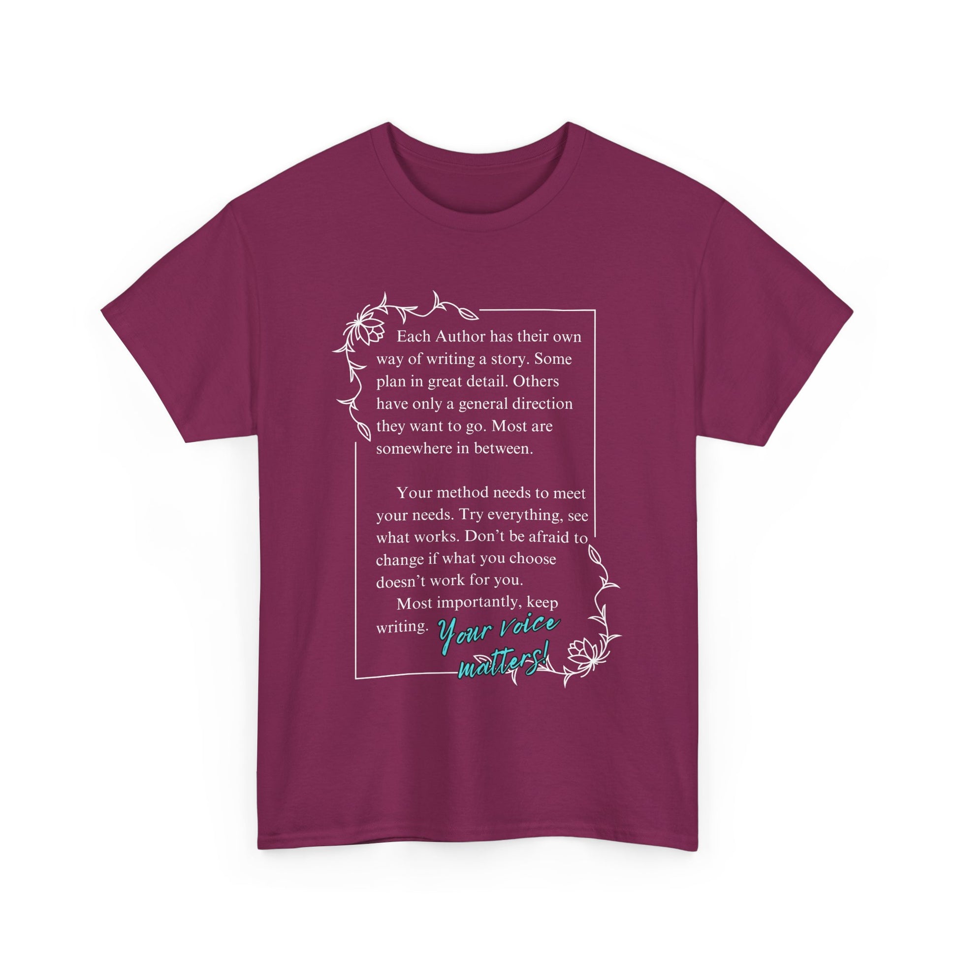 Introducing our Unisex Heavy Cotton Tee, perfect for all the writers and creatives in your life. This shirt radiates inspiration and comfort, making it an ideal companion for your daily adventures and moments of creativity. It feels soft against your skin, allowing for carefree movement whether you're at a cafe brainstorming ideas, or lounging at home, pen in hand, ready to draft your next masterpiece. It's designed for anyone with a passion for storytelling, making it a thoughtful gift for birthdays, graduations, or even as a treat for yourself during creative holidays like National Writing Month. This versatile tee is perfect for expressing your love of writing while providing comfort throughout the year.