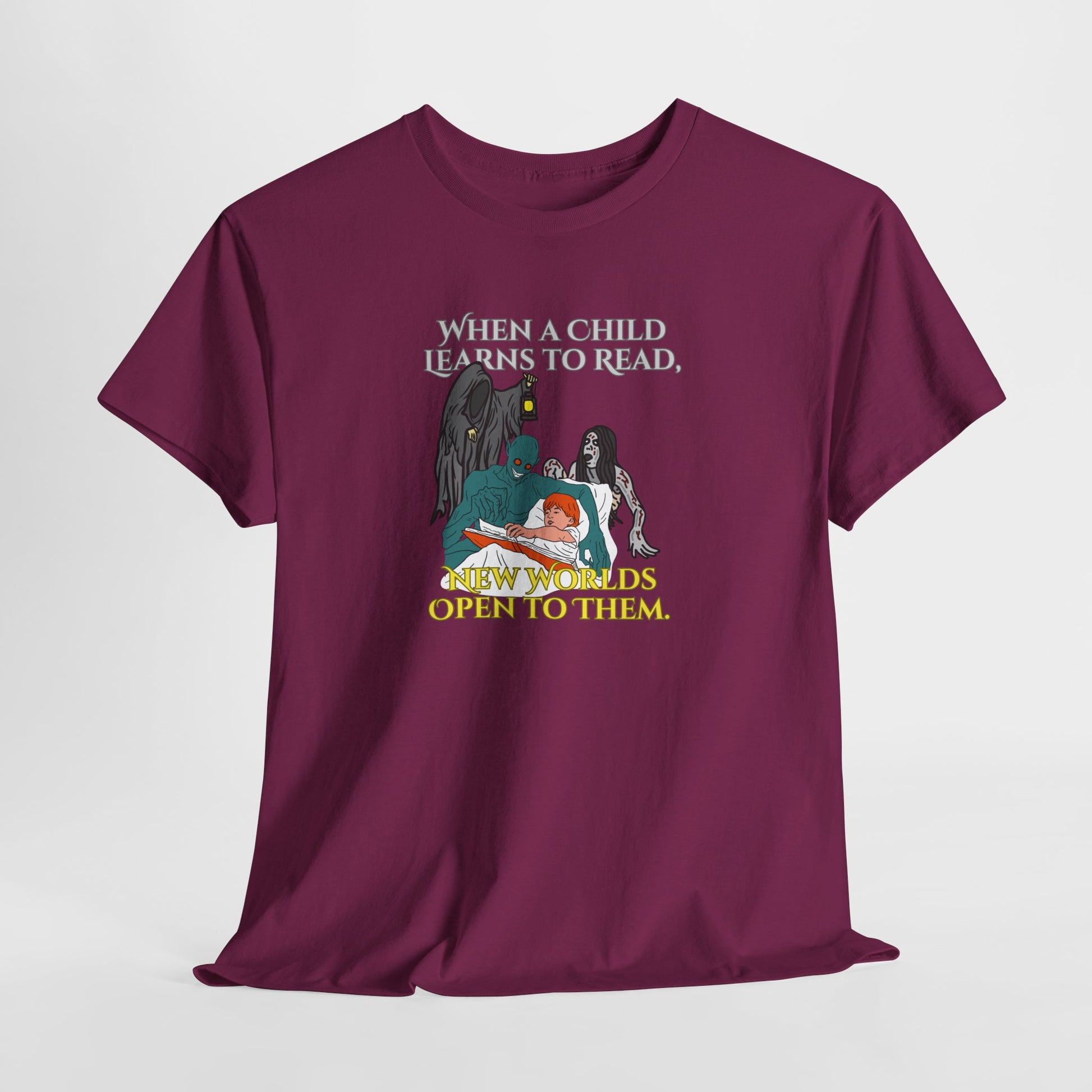 Inspirational Reading Tee - 'When a Child Learns to Read, Great Worlds Open to Them' Unisex Heavy Cotton Tee