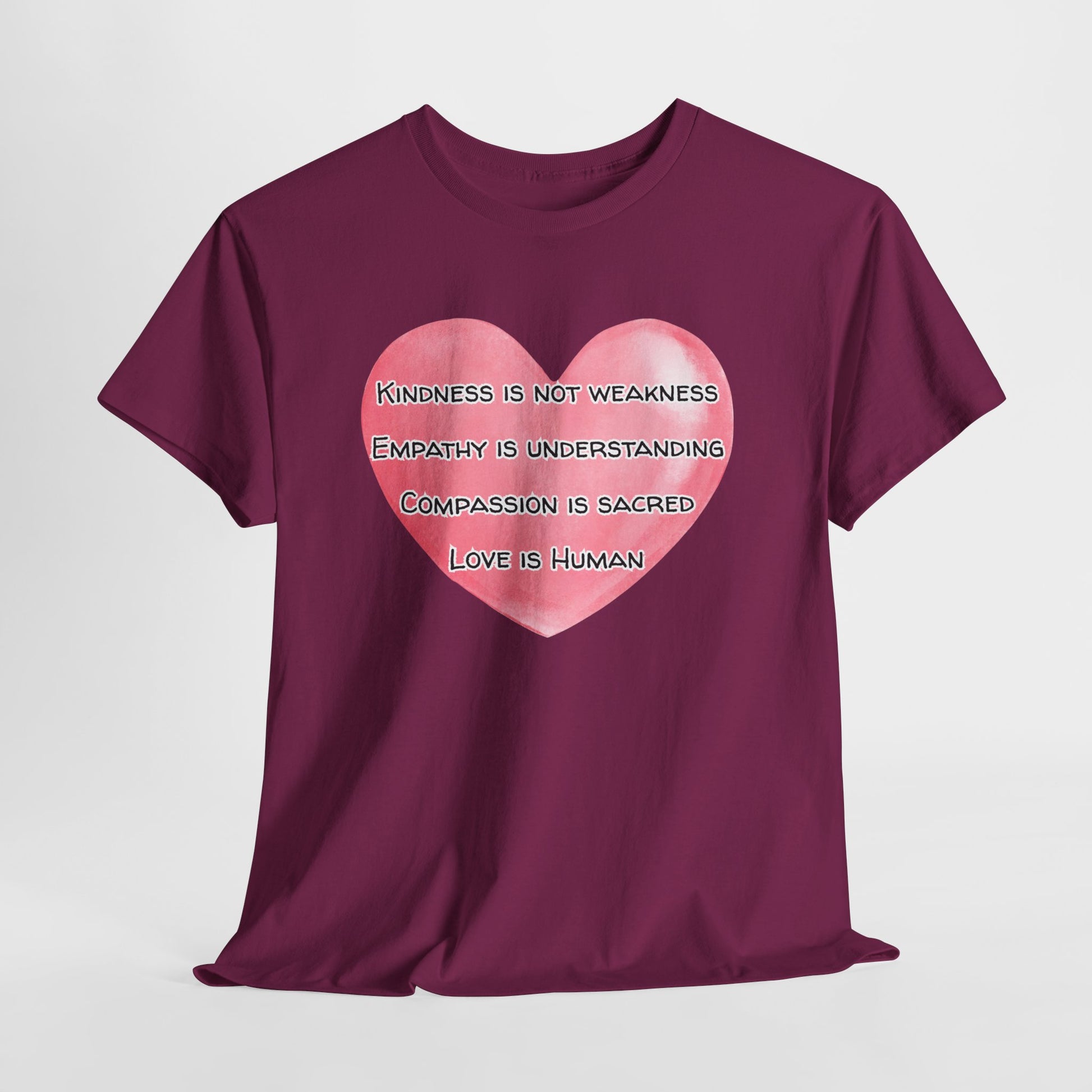Introducing our versatile Unisex Heavy Cotton Tee, designed to bring comfort and style to your everyday life. This tee features a heartwarming message that resonates with kindness, empathy, and compassion, making it a perfect reminder for personal growth and positivity. Ideal for those who appreciate meaningful fashion, it’s great for casual outings, community events, or just lounging at home. Celebrate love and understanding in your daily wear, making it a thoughtful gift for friends and family during occasions like birthdays, holidays, or simply as a gesture of appreciation. The soft fabric and relaxed fit ensure you'll feel comfortable while spreading a positive vibe wherever you go. Whether you wear it to a gathering, a brunch date, or as part of your loungewear, this tee fits seamlessly into your lifestyle.