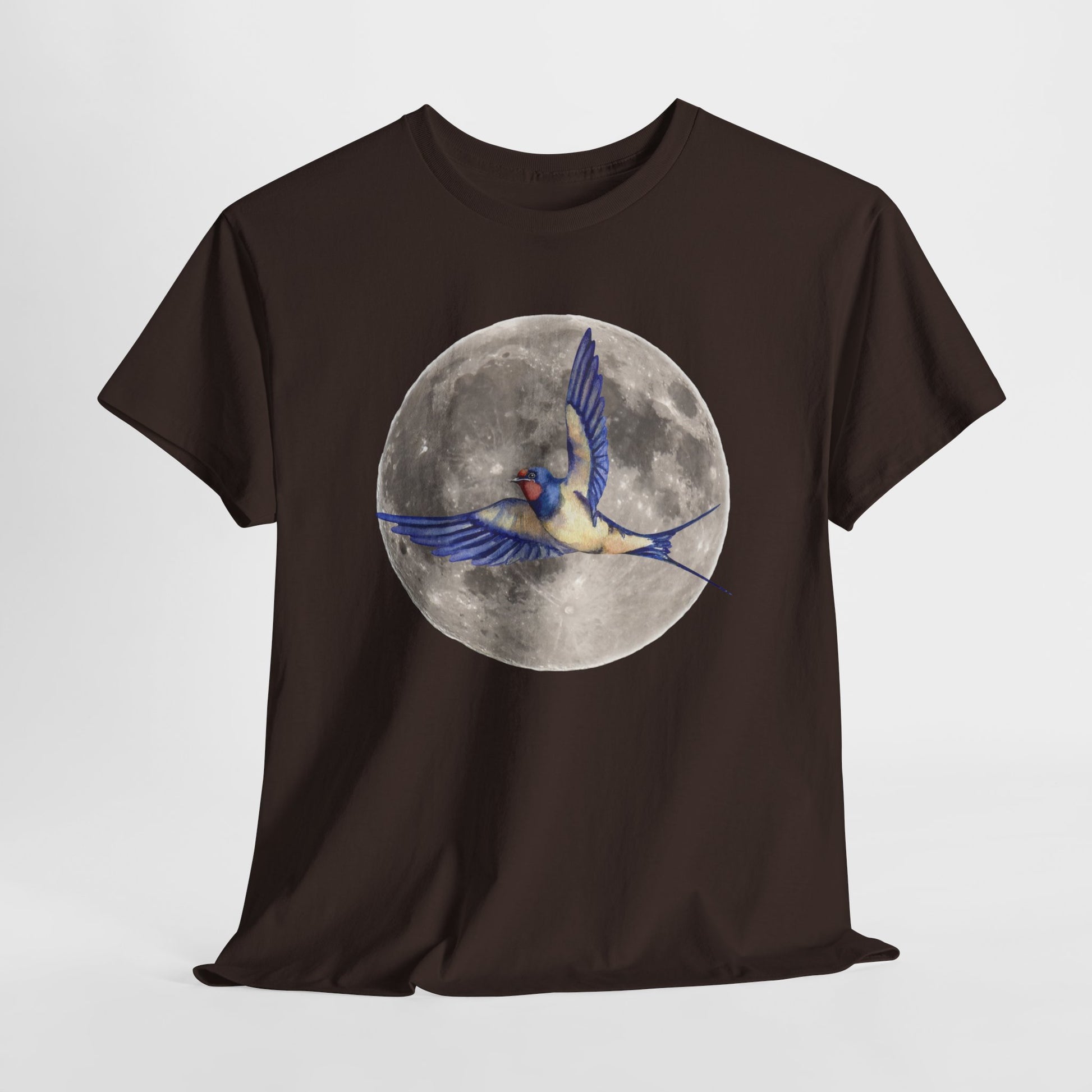 Moonlit Swallow Unisex Heavy Cotton Tee, Vintage Moon Tee, Bird Lover Shirt, Celestial T-Shirt, Nature Themed Apparel, Gift for Birdwatchers