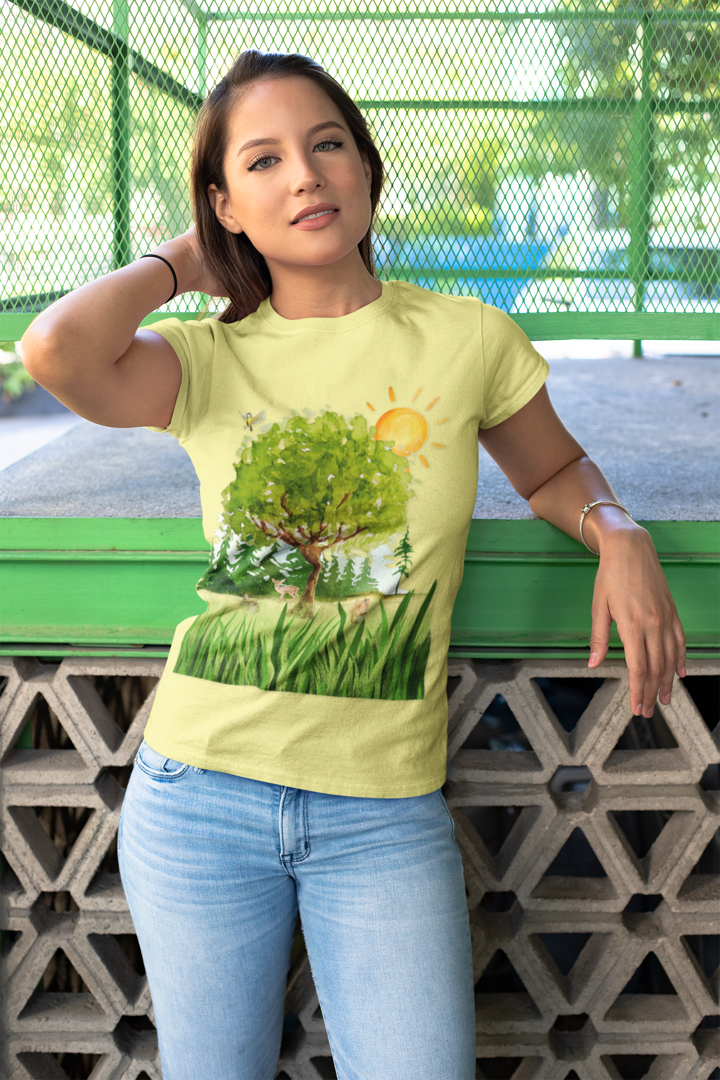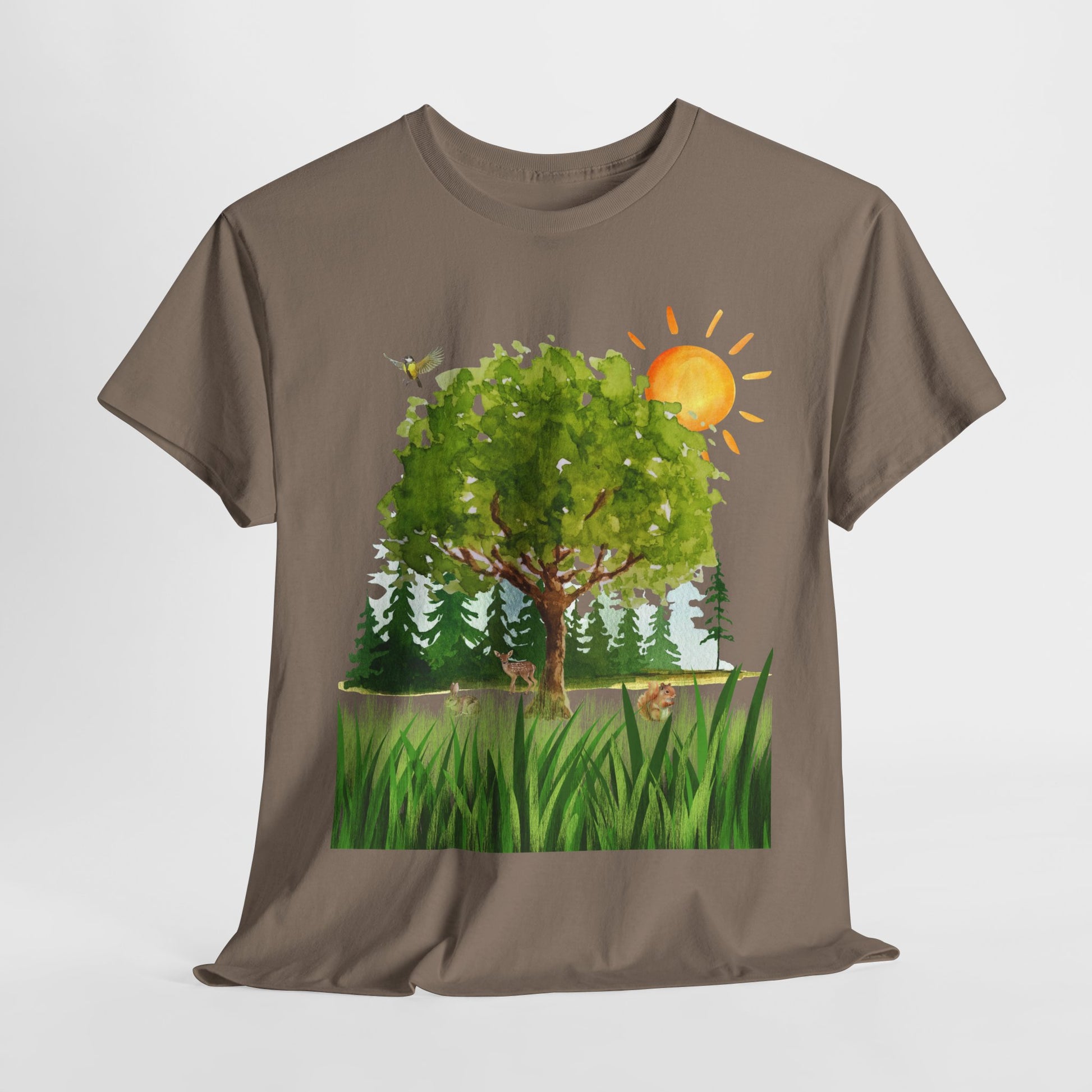 Nature-Inspired Unisex Heavy Cotton Tee with Tree and Sun Design