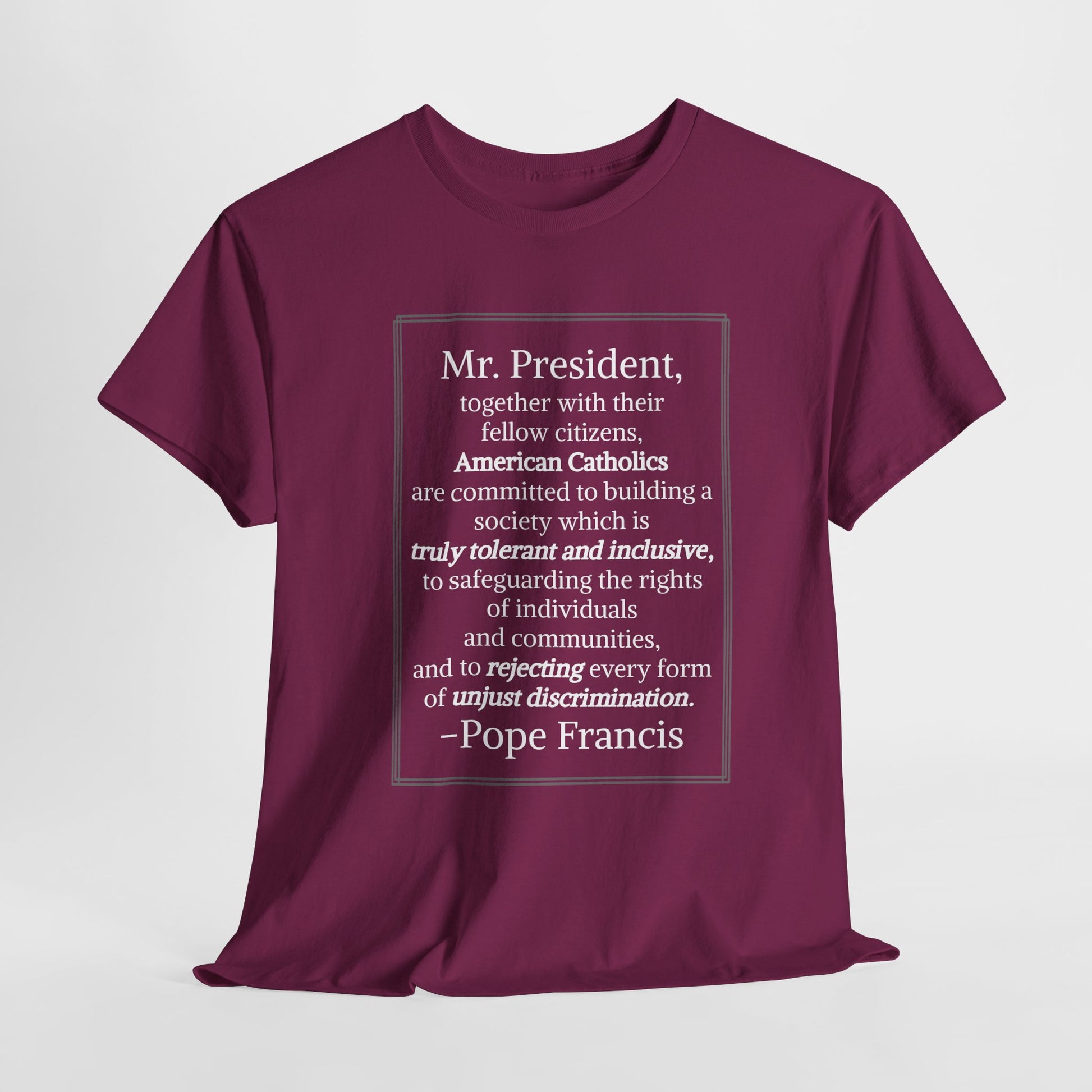 Introducing the Unisex Heavy Cotton Tee, a perfect blend of comfort and style. This tee exudes a relaxed vibe that's perfect for both casual outings and semi-formal occasions. Made with soft, ethically sourced cotton, it feels great against your skin while showcasing a meaningful message from Pope Francis, making it a statement piece for thoughtful individuals. It’s ideal for adults who appreciate socially conscious apparel and want to engage in conversations about tolerance and inclusion. This tee is great for everyday wear, gatherings, or special occasions, inviting a spirit of togetherness during holidays or social events. Whether for yourself or as a gift, it caters perfectly to those who value both style and substance.