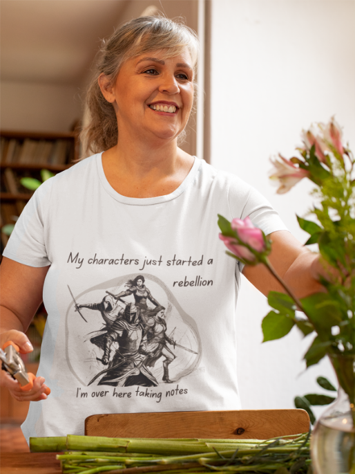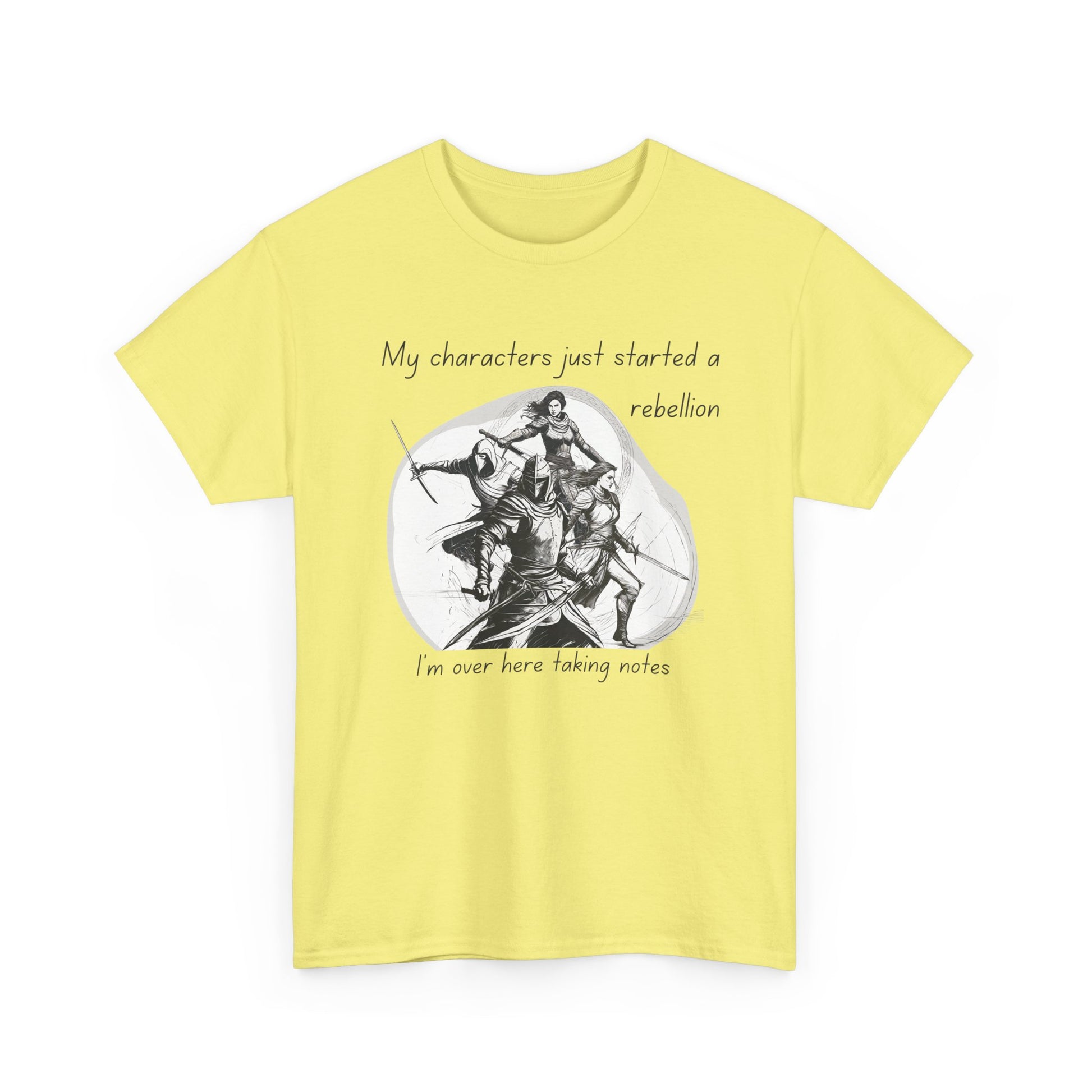 This T-Shirt features a rebellious design with the quote 'My characters just started a rebellion I'm over here just taking notes'. It gives off a bold and edgy vibe, perfect for those who appreciate unique and statement-making clothing. This tee is ideal for adults looking to showcase their individuality and sense of humor. It is great for casual wear or as a conversation starter during social gatherings and events.