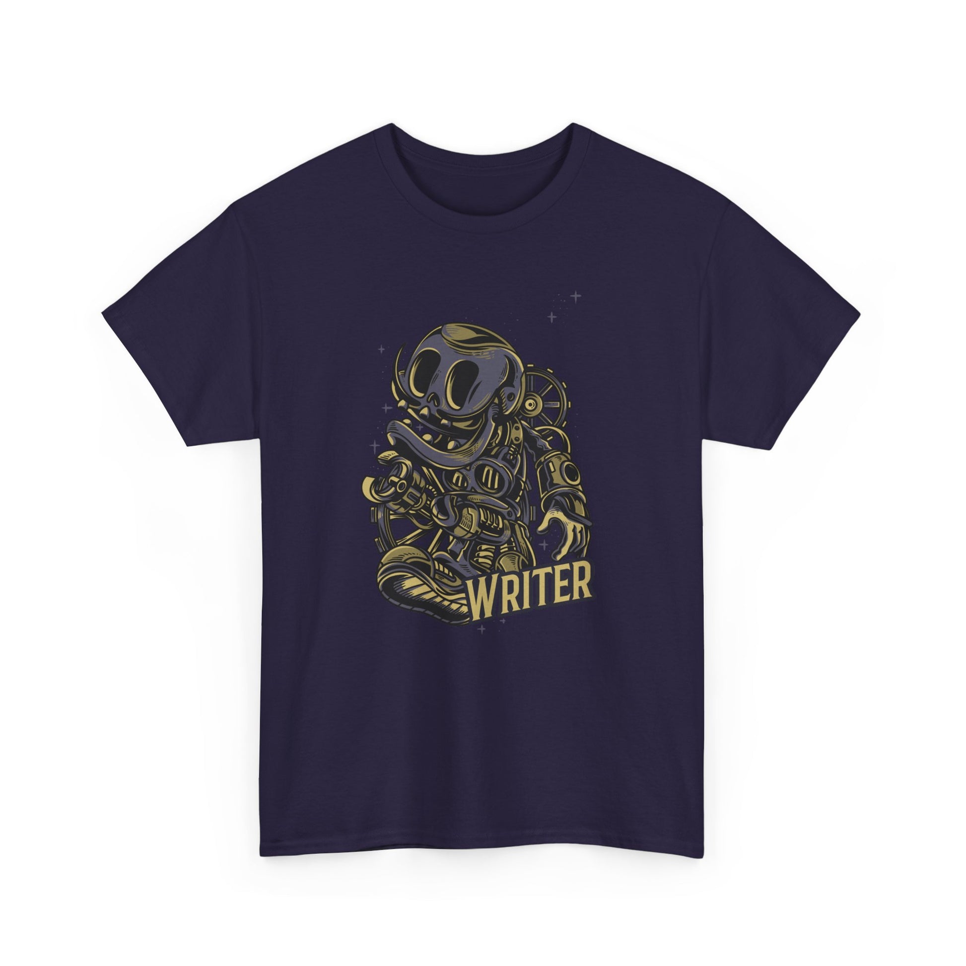 A quirky and playful tee featuring a design of a silly death robot, perfect for writers and creatives looking to add a fun and artistic touch to their wardrobe. This tee is ideal for casual wear or as a statement piece on special occasions like literary events or writer meetups.