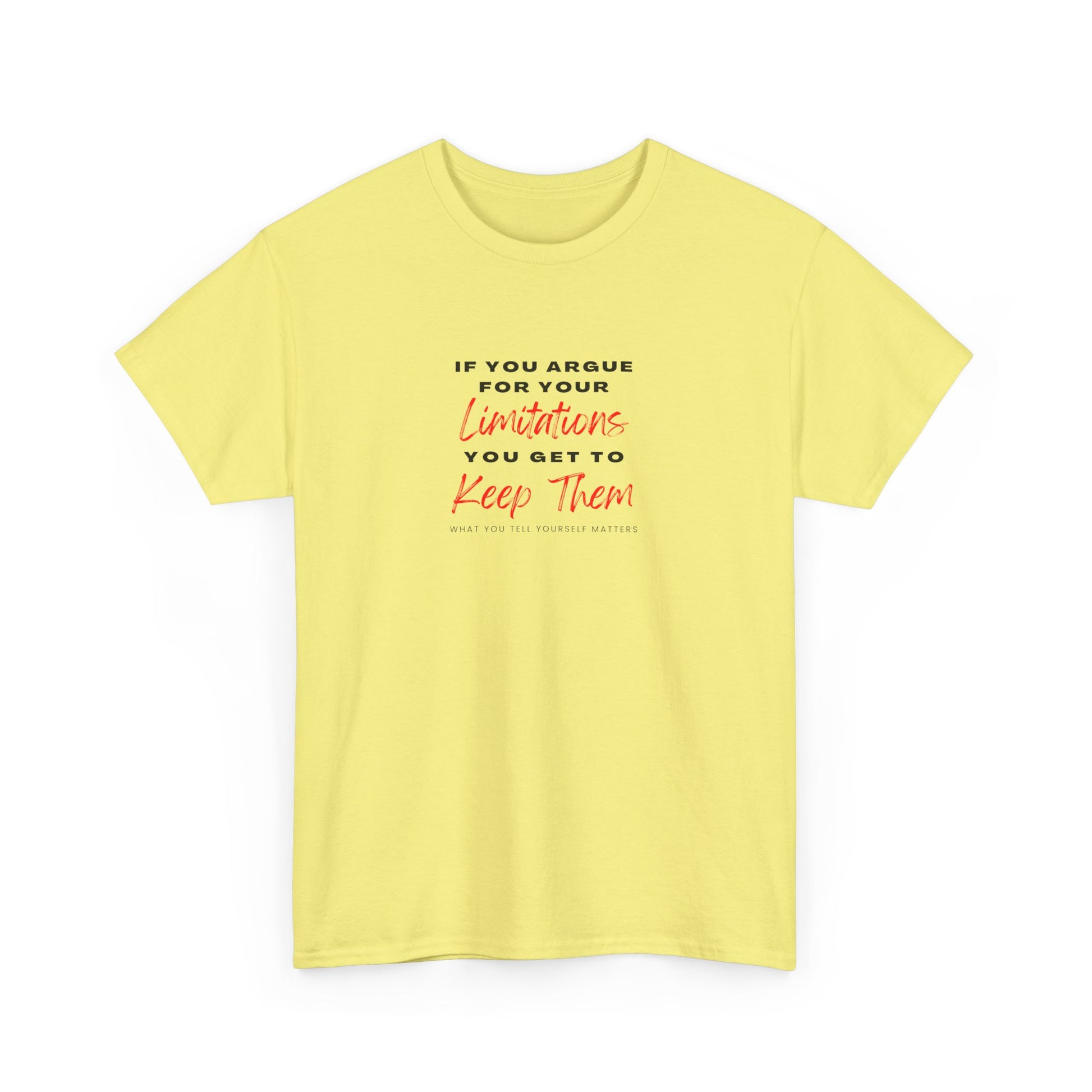 This Tee features a quote that encourages self-empowerment and overcoming limitations. It offers a classic fit, tear-away label, and sustainable cotton fabric, perfect for year-round wear. Ideal for adults looking for a comfortable yet stylish tee that can be worn casually or semi-formally. Relevant for self-growth events, empowerment workshops, and everyday wear.