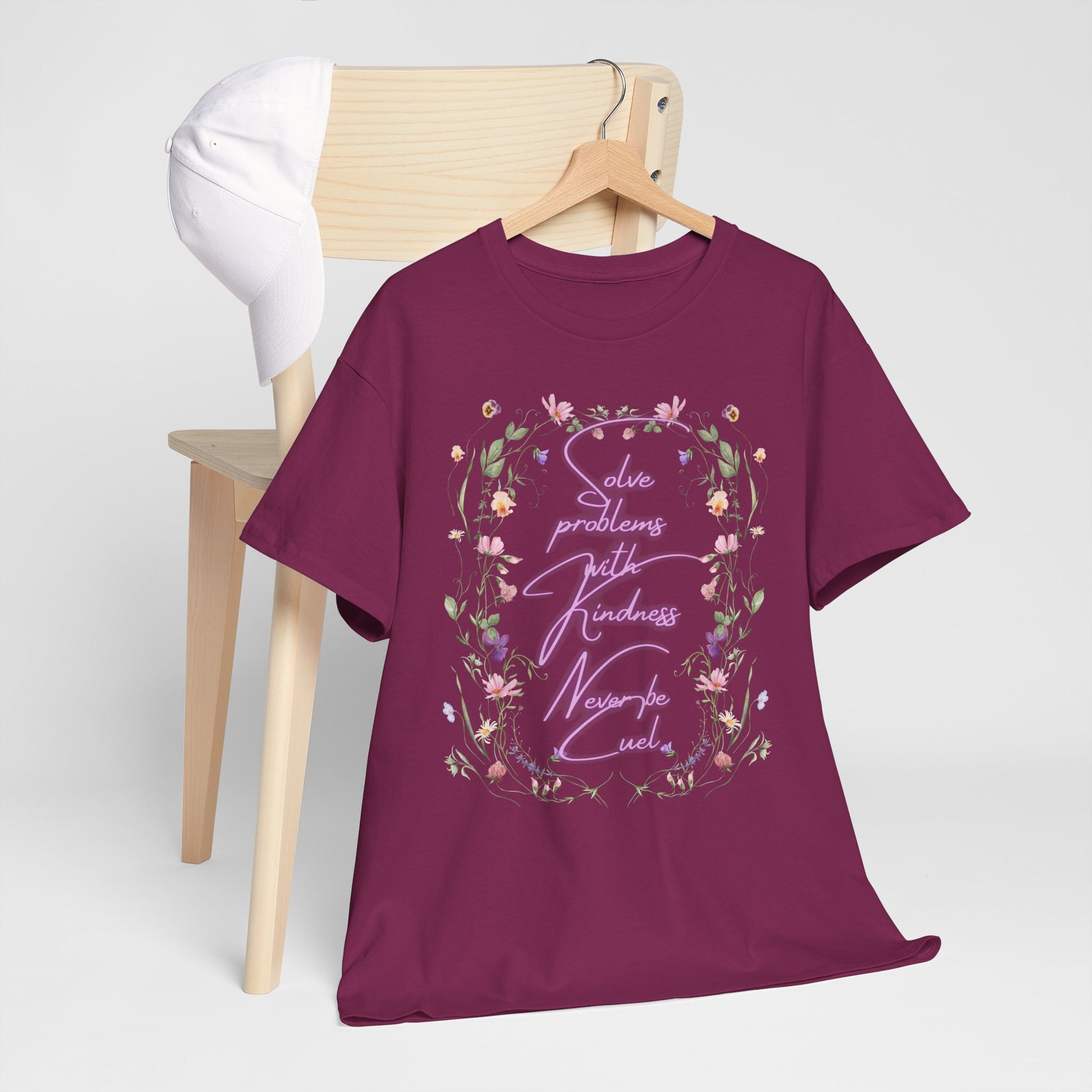 Introducing our Unisex Heavy Cotton Tee, a perfect blend of comfort and style that speaks volumes. This shirt features a charming floral design with the inspiring message "Solve Problems with Kindness, Never be Cruel." Ideal for those who value positivity and compassion in their daily lives. Its versatile design allows you to dress it up or down, making it a staple piece for casual outings, social gatherings, or relaxed days at home. Perfect for gifting during holidays like Mother's Day, birthdays, or just to brighten someone's day, this tee resonates with anyone who believes in spreading kindness. Whether you’re lounging with friends or out on an adventure, this tee offers a soft, relaxed fit that combines ease and elegance. Grab yours and wear your values with pride!