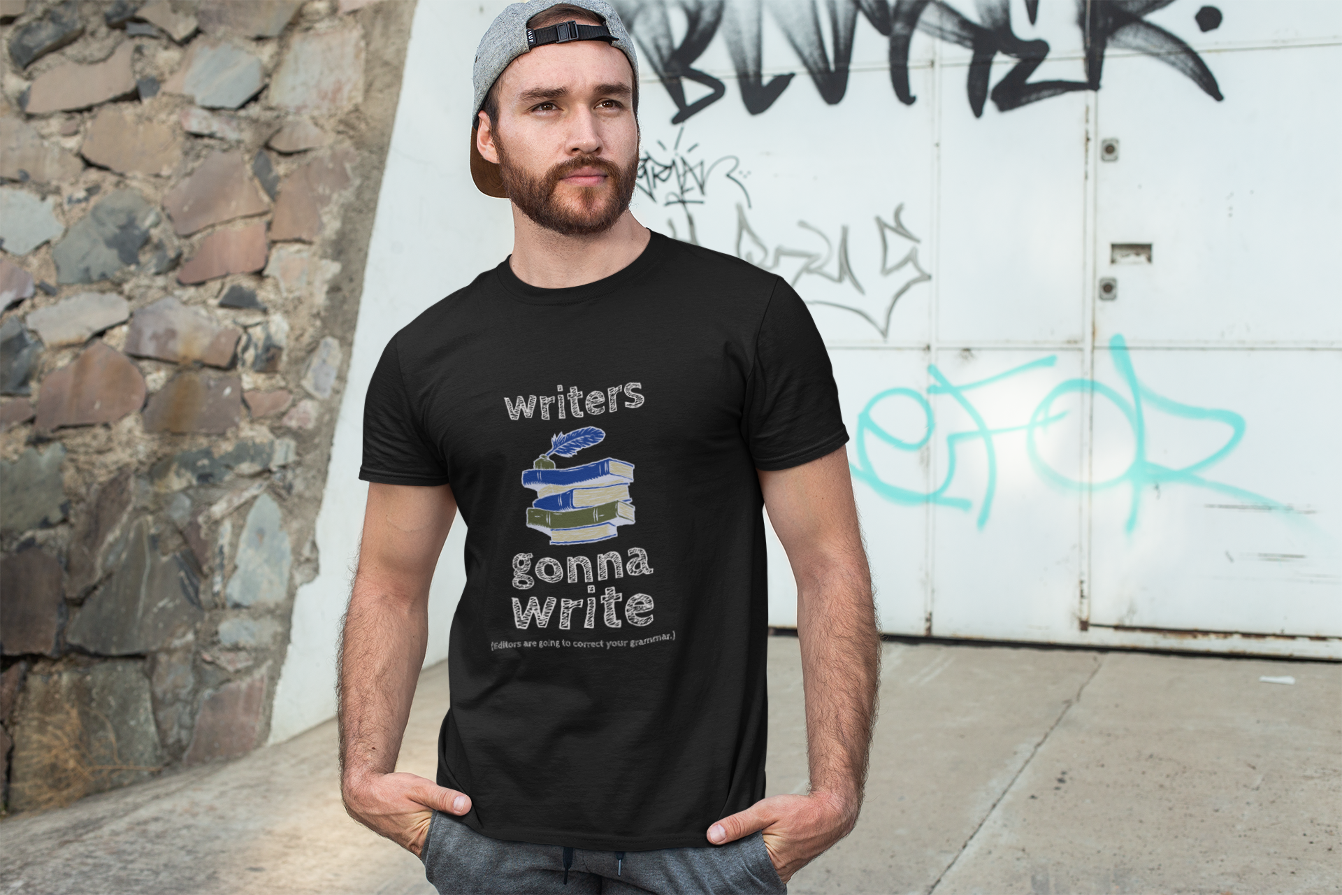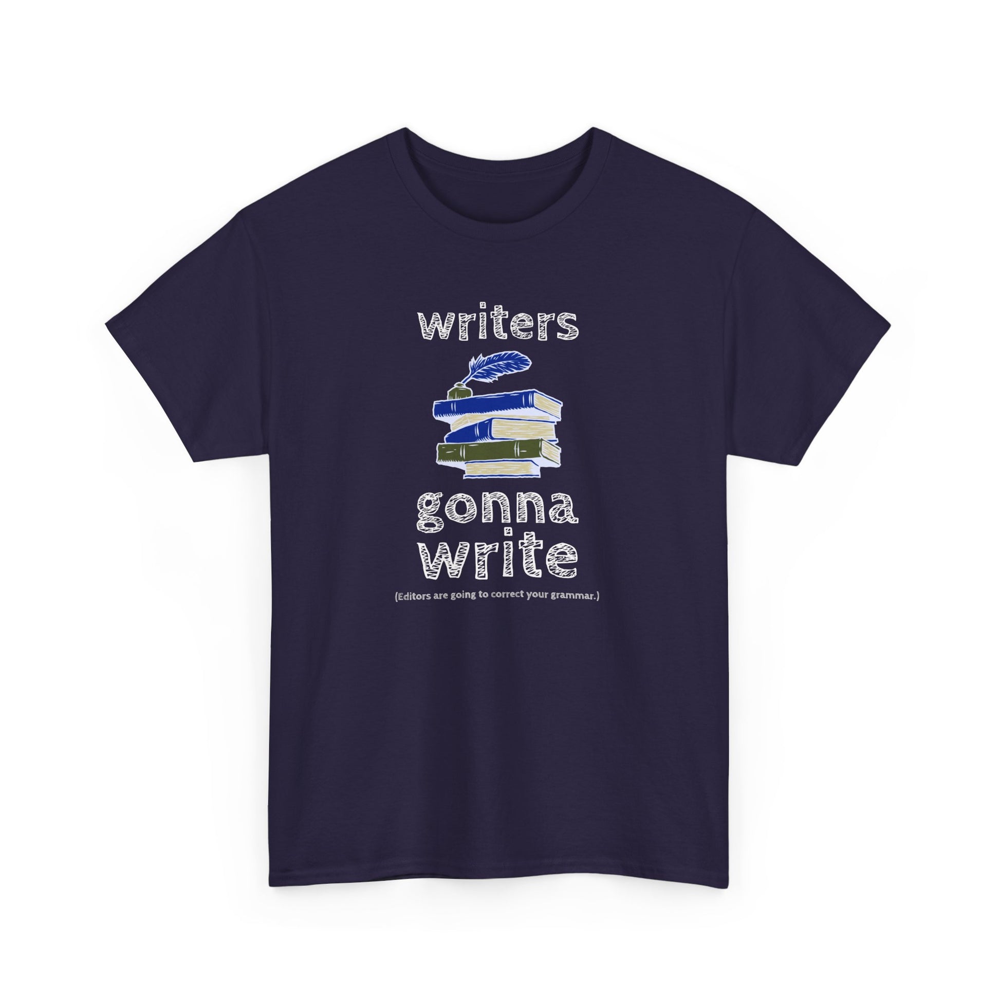 A classic unisex heavy cotton tee featuring the phrase 'Writers gonna write'. Perfect for writers, book lovers, and anyone who enjoys expressing themselves through writing. Ideal for casual wear or as a statement piece on a writing retreat. Great for National Novel Writing Month (NaNoWriMo), World Book Day, and literary events.